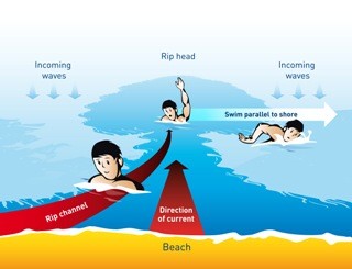 Rips are strong currents running out to sea that can easily take swimmers from shallow water out beyond their depth. They are especially powerful in larger surf, but are also found around river mouths, estuaries and man-made structures like piers and groynes.