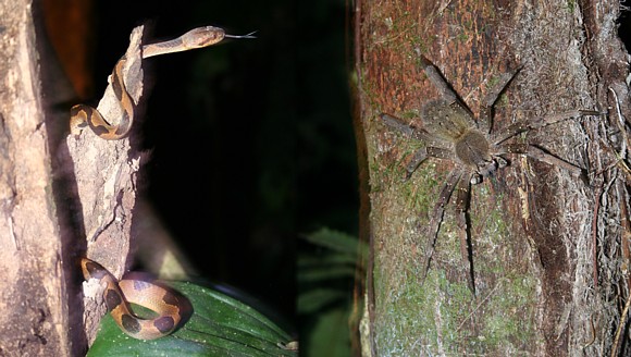 Just another 30 minutes down the river and we were at the lodges of Bonanza. It was a nice place with friendly people and a small very cute puppy. We were later told it was to replace the one that the Jaguar ate! OK! Maybe that was to wind us up but who knows! Anyway, I managed to get on the wrong side of a nest of fire ants that evening so the jungle formula went straight on! It was great to settle down that night for dinner under a clear sky and watch the various things flying around. But that was not the end of our night and we were soon back on the boat looking for Caiman. We spotted a few pairs of eyes staring back at us but didn’t see and Caiman moving around. However, we were told we would have more chances to see them in the next few days. We stopped the boat on a sand bank and William (our local guide) took us on a night walk through the jungle. We had to stop every few meters because something had been spotted on a tree or on a leaf. It was amazing! Everything from moths, crickets, scorpion spiders, snakes, frogs and all manner of creepy crawlies. It was really interesting listening to William explain how they survive, what some of the trees are used for and which things to avoid touching. It was a great night and a pity to have to get back to the lodge. There was also a river crossing involving a huge log and a big drop and not a lot else. Of course we were told that the Caimans hung about underneath it which we were hoping was a joke but were all glad to get across without falling in lol.