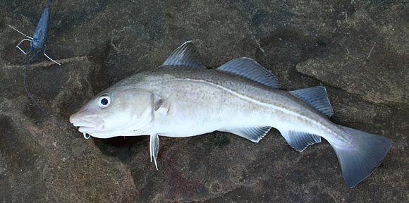 I had just set up the second rod when I noticed the tip on my first rod bouncing around. I struck and felt the fish on. It didn’t feel like an eel! I wound-in, trying to keep my rig and the fish up in the water and away from snags, and eventually a cod around 2-3lb appeared. Finally the cod were showing and after so many cod-less days it was a bit of a relief.
