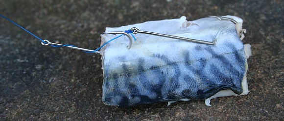 I set the first rod up on a running leger rig with a single-hook bait but on a twin-hook rig. I put a nice chunky piece of mackerel on, making sure the hooks were fairly free to improve hooking. I then injected the fish with a fish oil attractant which I have found to work really well in brown water where smell is all-important. First cast, slightly into the bay of Ladye Bay and back into my protective gap in the rocks.