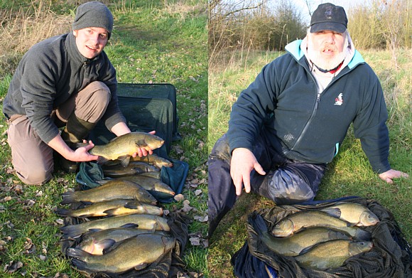 Alan went first and pulled out 4 tench up to 3 1/4lb and a stray rainbow trout – a good winter’s net!
