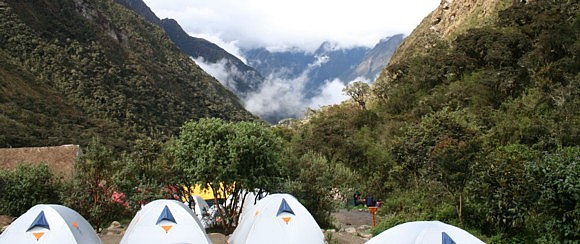 The bus journey to the start of the trail was scenic with plenty of rolling hills and the odd snow capped mountain to keep you planning trips in your head. After a brief stop for breakfast and the purchase of a trusty Inca Trail walking stick we were at the beginning of the trail. It was a simple gateway welcoming you to the trail followed by a rather bouncy bridge over the Urubamba river at 2,600 metres. The sun had began to rise now and the valley started to warm up. We knew we had a 12-kilometer walk in front of us which was mostly uphill, so we decided to pace ourselves and take plenty of water on board. The head guide made plenty of stops on the track, where he would explain many interesting things about the flowers and wildlife, including where the local people get some of the dyes for those amazing blankets they make. One stop was to look down on our first Inca ruins of Patallacta. We were fairly high above them so we could only gaze at them from a distance while we listened to the stories from our guide. However it was our first view of the familiar terraced ruins so commonly associated with the Incas. Quite a sight! After a nice lunch break at a small nearby camp/farm we were back on the trail and heading to our first overnight camp. This was one of the nicest walks we have done with the added attraction of humming birds darting across the path in front of you. Finally, we reached the first camp at Wayllabamba at 3,100 metres. A small village with a camp site neatly set in the centre with the added bonus of local entertainment from to of the local kids showing us some acrobatics and funny impressions. These kids have next to nothing compared to kids in the UK, but they seemed happy and contented playing with what little toys they did have – who needs a play station!?!?