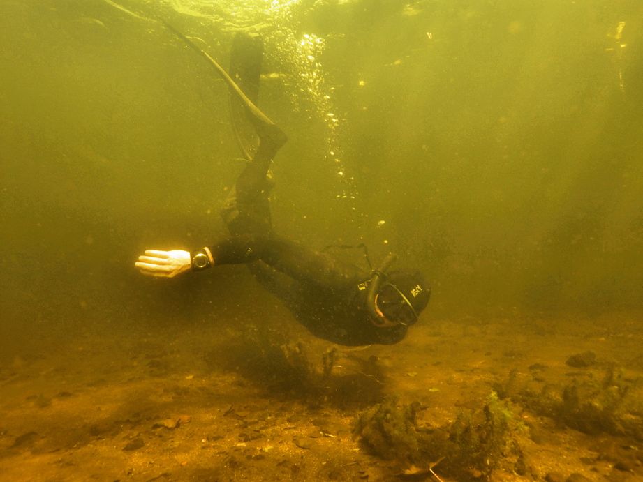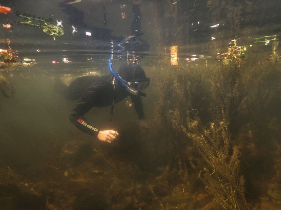 The biggest fish of the day was a Pike in probably about eight feet of water which just went right under me as if I wasn’t there. The deepest water was under a huge Oak tree which just happened to have a rope hanging from it, Andy was first to jump in wearing full snorkel gear, not only did it look funny but felt funny clambering up the banks with fins on! It was a nice break from being face down and a chance to play up for the camera!