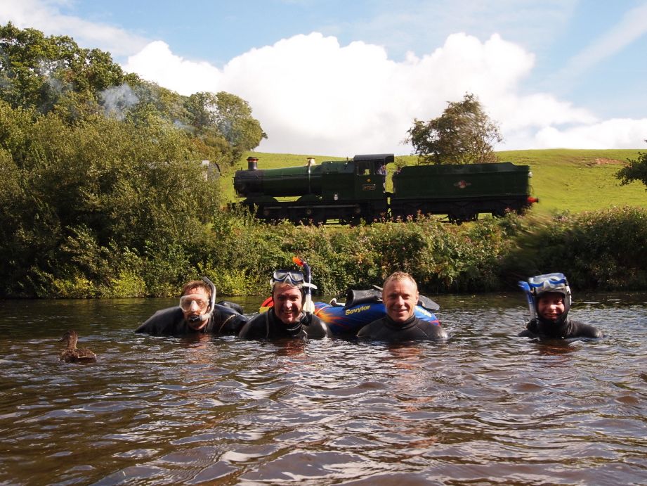 When we finally reached our get out point, which flew by, we just had time to get a picture with the steam train in the background and make friends with a young Mallard duck, who found five men dressed from head to toe in neoprene very interesting!