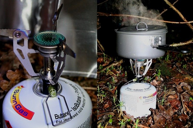 The stove itself packs away to pretty much nothing and weighs just 72g! The pan supports fold around together, then in on themselves, the flame control handle then folds over the attachment, leaving you wondering it they could ever improve on it! At 8 1/2 cm by about 6 1/2 cm rectangular and 3 1/2 cm deep, you can fit this almost anywhere. Of course the fuel bottle is the biggest part of the setup, the one I used was a circular gas cartridge.