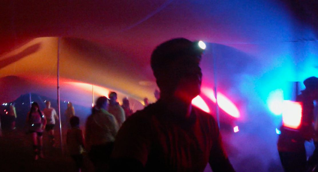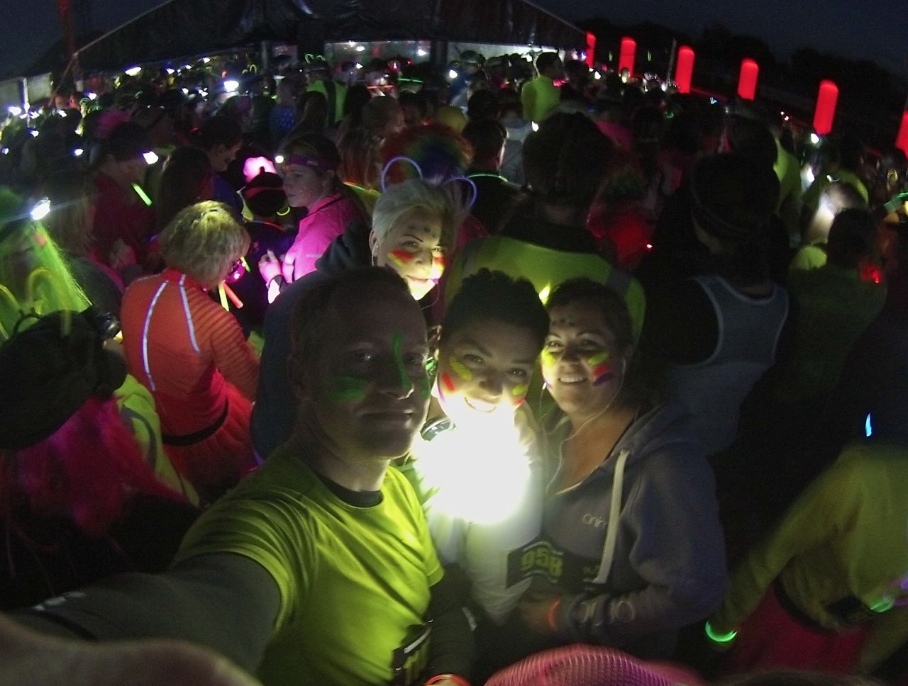Glow in the Park is fairly self explanatory really, it’s a charity event where you are given the option to dress in as many neon clothes as possible and light yourself up with all kinds of stuff, glowsticks, neon paint and a key piece of equipment, a head torch. Whilst running around the pitch-dark course you aim towards various ‘light-zones’, which are big tunnel tents set up jog through, all with their own musical themes, which make the whole event a glowing, bright and social event.