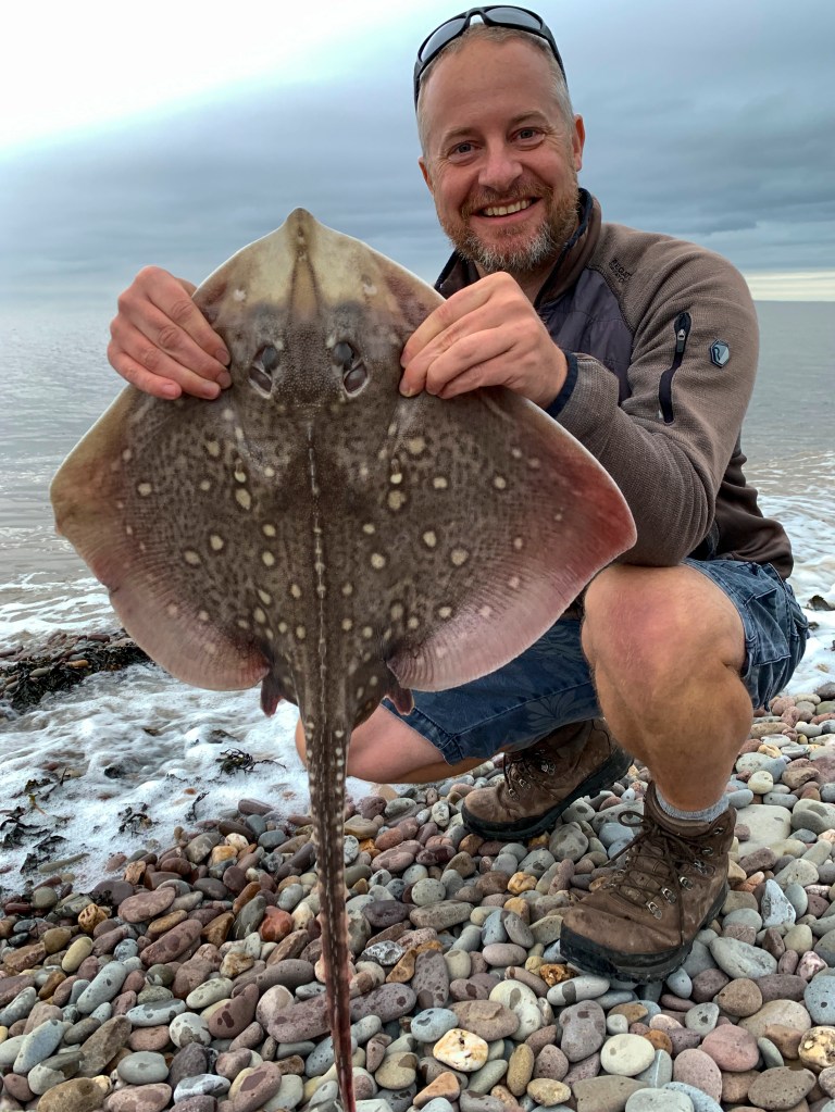 A really nice Female Thornback Ray around 6lb and a PB for me, could this get better? Well shortly after another Thornback Ray was on the beach, this time a male around 8lb and another PB!